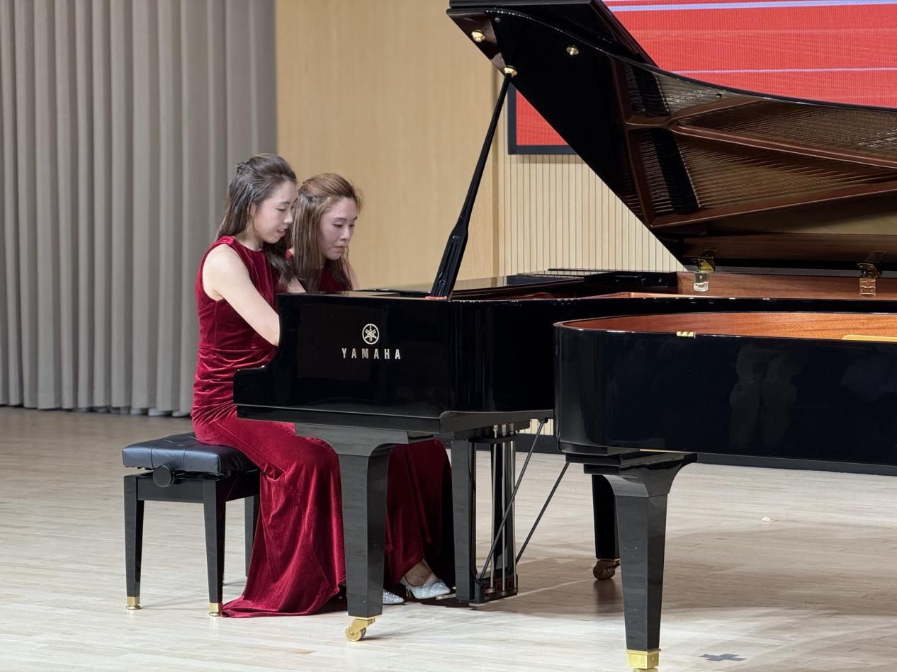 曾被誉为“默契十足的精准演绎,恍如出自一人之手般自然流畅,令人惊艳”的周乐娉、周乐婷双钢琴演奏,让在场的师生们如沐春风、沁人心脾,灵动的指尖在琴键上跳跃,时而激情澎湃、奔放如信马由缰,时而轻柔婉转、缓缓如流水潺潺。