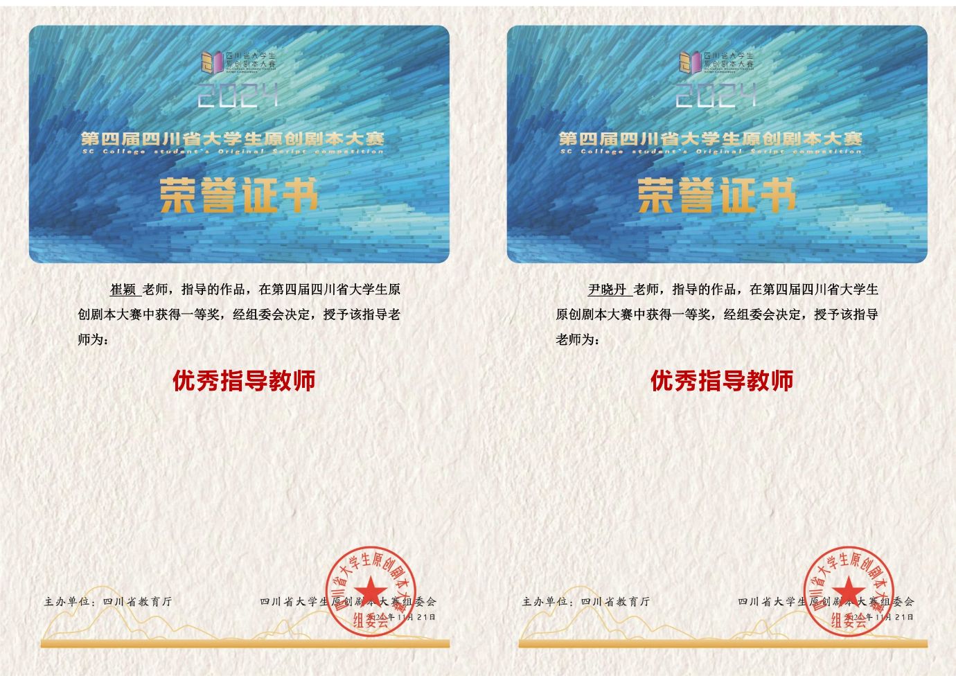 近日,由四川省教育厅主办、四川师范大学承办,四川省作家协会、青神县委宣传部等单位协办的2024年第四届四川省大学生原创剧本大赛落下帷幕,经过激烈的角逐和专业的评审,万象城新闻与传播学院师生表现出色,共获得3个一等奖、8个二等奖以及4个三等奖,崔颖、尹晓丹两位老师获“优秀指导教师”。