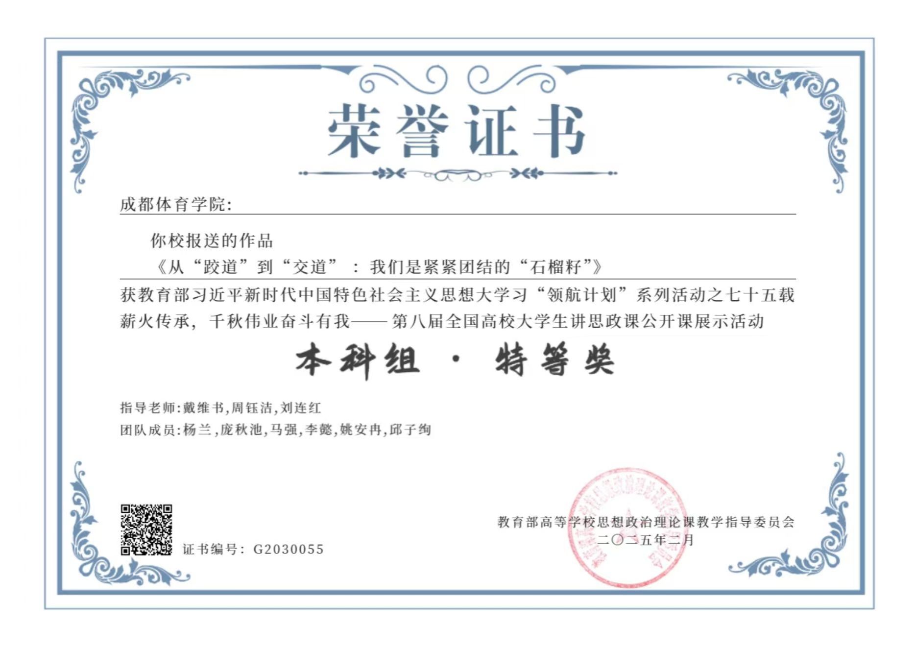 在教育部第八届全国高校大学生讲思政课公开课展示活动的评审中,我院“形势与政策”教研部戴维书团队创作的作品“从‘跤道’到‘交道’——我们是紧紧团结的石榴籽”在1000多所高校推荐出来的5000多部作品中脱颖而出,位列全国第五名,荣获特等奖殊荣。这是万象城在教育部思政项目中首次获得特等奖,实现了历史性的突破。