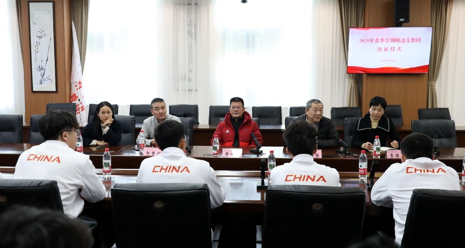 2月28日下午,学校2025年春季学期峨边支教团出征仪式在行政楼416会议室举行。学校党委副书记胥万兵、体育教育学院党委书记郭晋川、副院长李德华参加仪式。出征仪式由乡村振兴办主任张强主持。