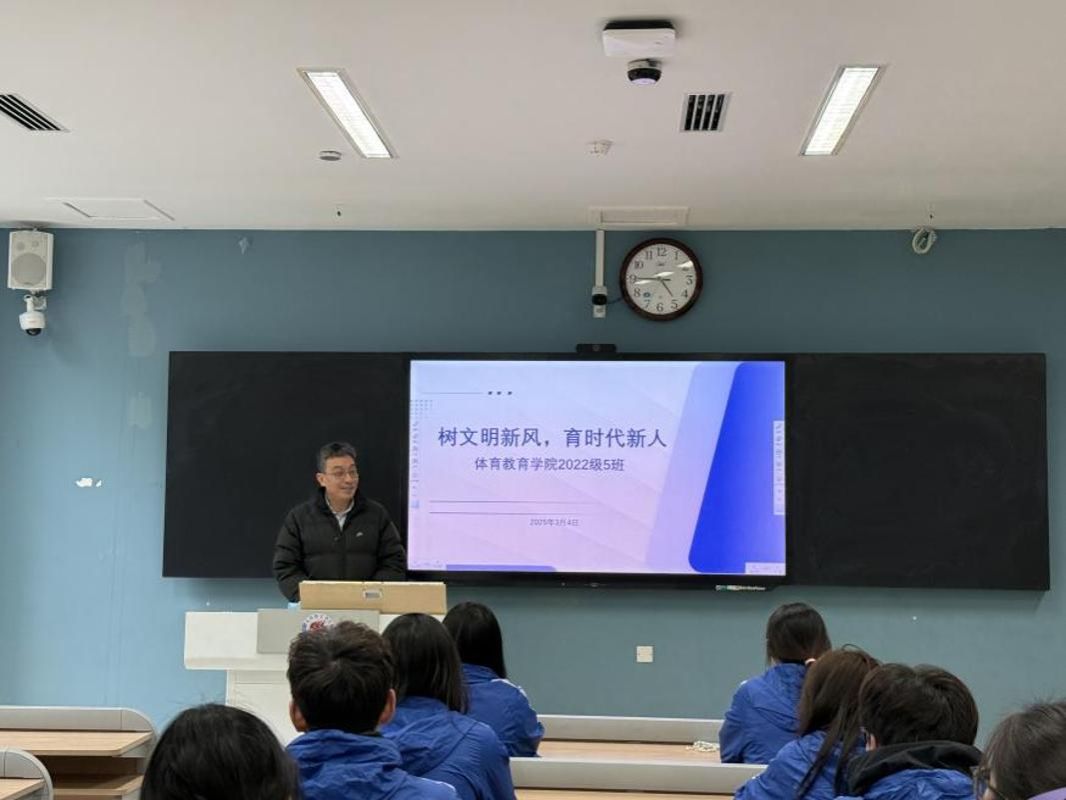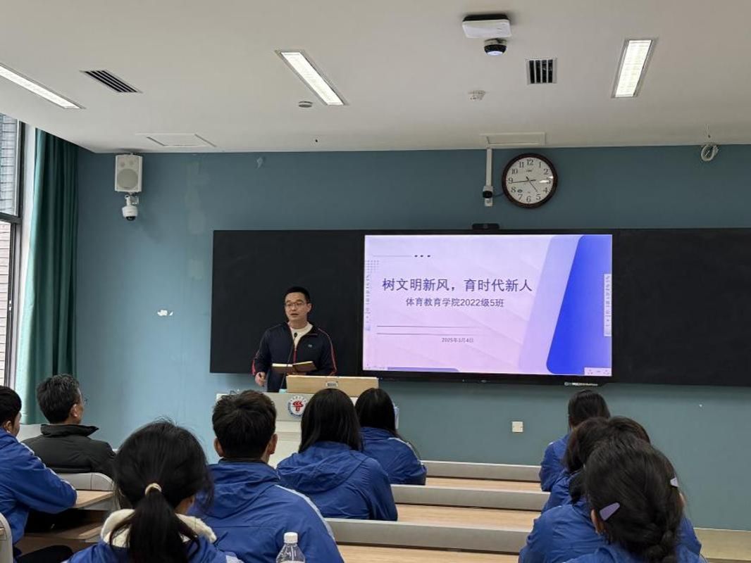 为全面落实立德树人根本任务,深化文明校园建设,3月6日下午4时50分,体育教育学院2022级5班召开“树文明新风,育时代新人——养成教育”主题班会。班会由杨光厅主持,学校校长潘小非作为校级领导联系人参加了此次班会,体育教育学院副书记杨彪参会,班会围绕文明校园建设、教育本质、职业规划、传统文化与社会责任等议题展开深入交流,为学生们带来了一场思想与行动的启迪之旅。