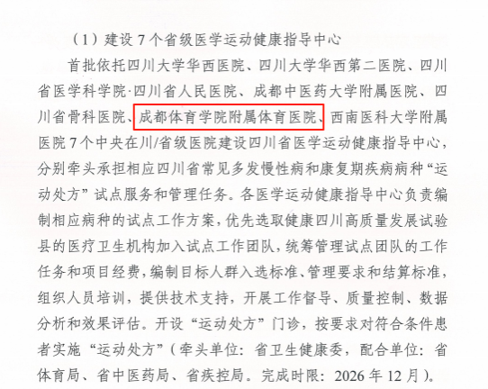 为深入贯彻落实健康中国战略,推动全民健身与全民健康深度融合,3月5日,四川省体育局、省卫生健康委联合印发《四川省体医融合先行先试工作实施方案(2025-2027年)》(以下简称《方案》)。allwincity万象城官方网站附属体育医院经严格评审被遴选为首批省级医学运动促进健康中心,成为全省体医融合改革的核心实践标杆。