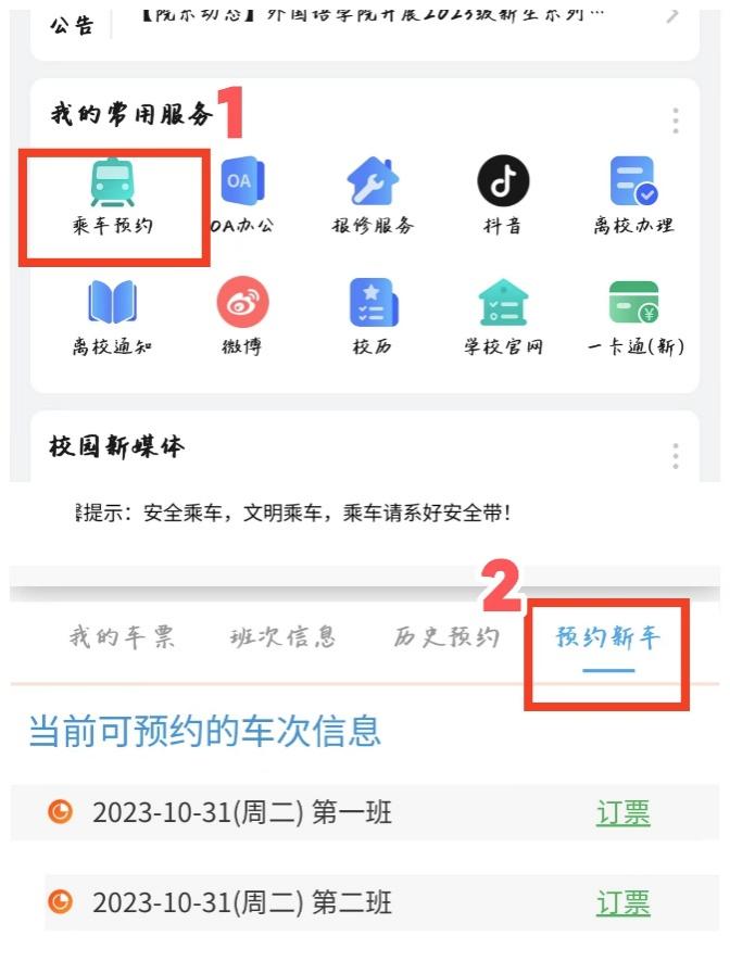 为更好的为大家提供交通车服务,维护乘车秩序,原扫码进入的成体校区乘车预约系统不再使用,从10月31日(周二)起,请大家在智慧成体平台中直接使用“乘车预约”服务进行车辆预约,预约成功后获得的电子车票作为乘车凭证,请在上车时向驾驶员出示电子车票;同时,开放一次性预约一周乘车的功能,预约时间为每天9:00-21:00,乘车请提前预约。