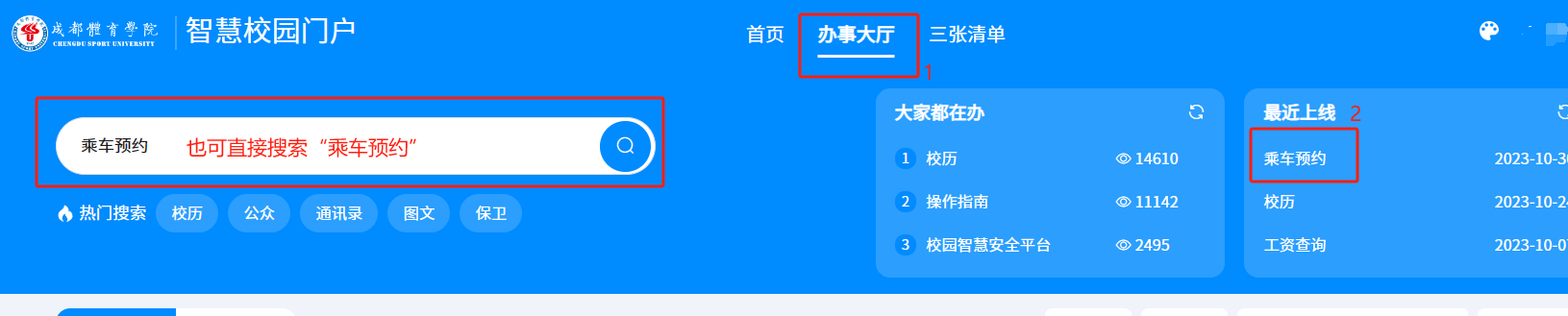 进入智慧成体网站→办事大厅→最近上线→乘车预约→预约新车
