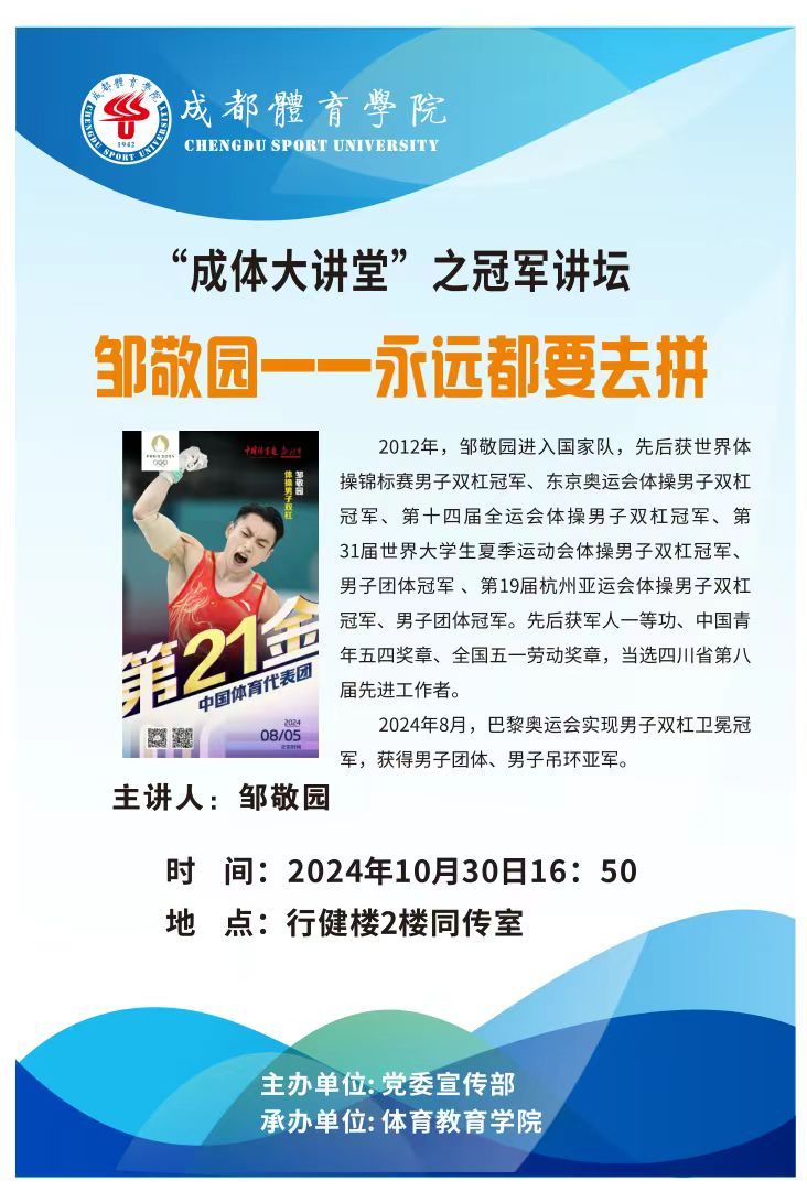 学校将于2024年10月30日(星期三)下午16:50在行健楼2楼同传室举行成体大讲堂之冠军讲坛。本次讲座特邀万象城校友、蝉联两届奥运会男子双杠金牌的邹敬园主讲。题目为:永远都要去拼。欢迎全校师生积极参加。