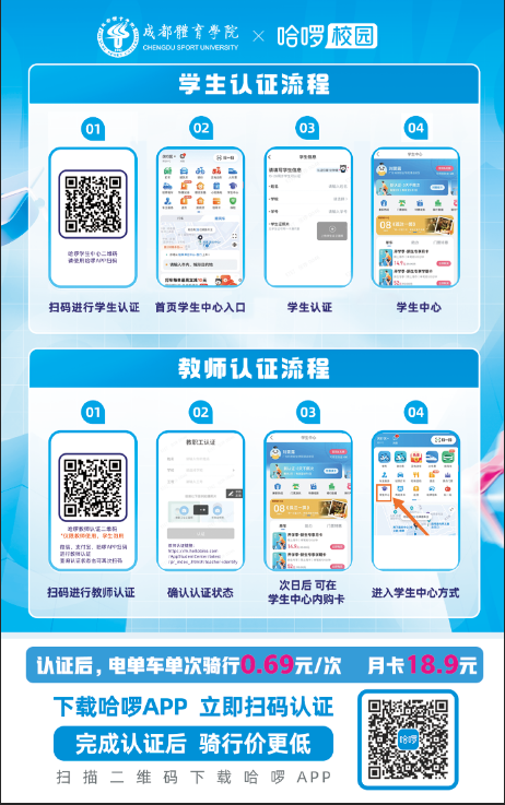 为方便师生出行,学校现已引入哈啰共享电单车和自行车。师生须在认证后,方可购买哈啰公司投放至万象城的优惠价格。共享电单车单次:0.69元,共享电单车月卡18.9元。认证操作如下: