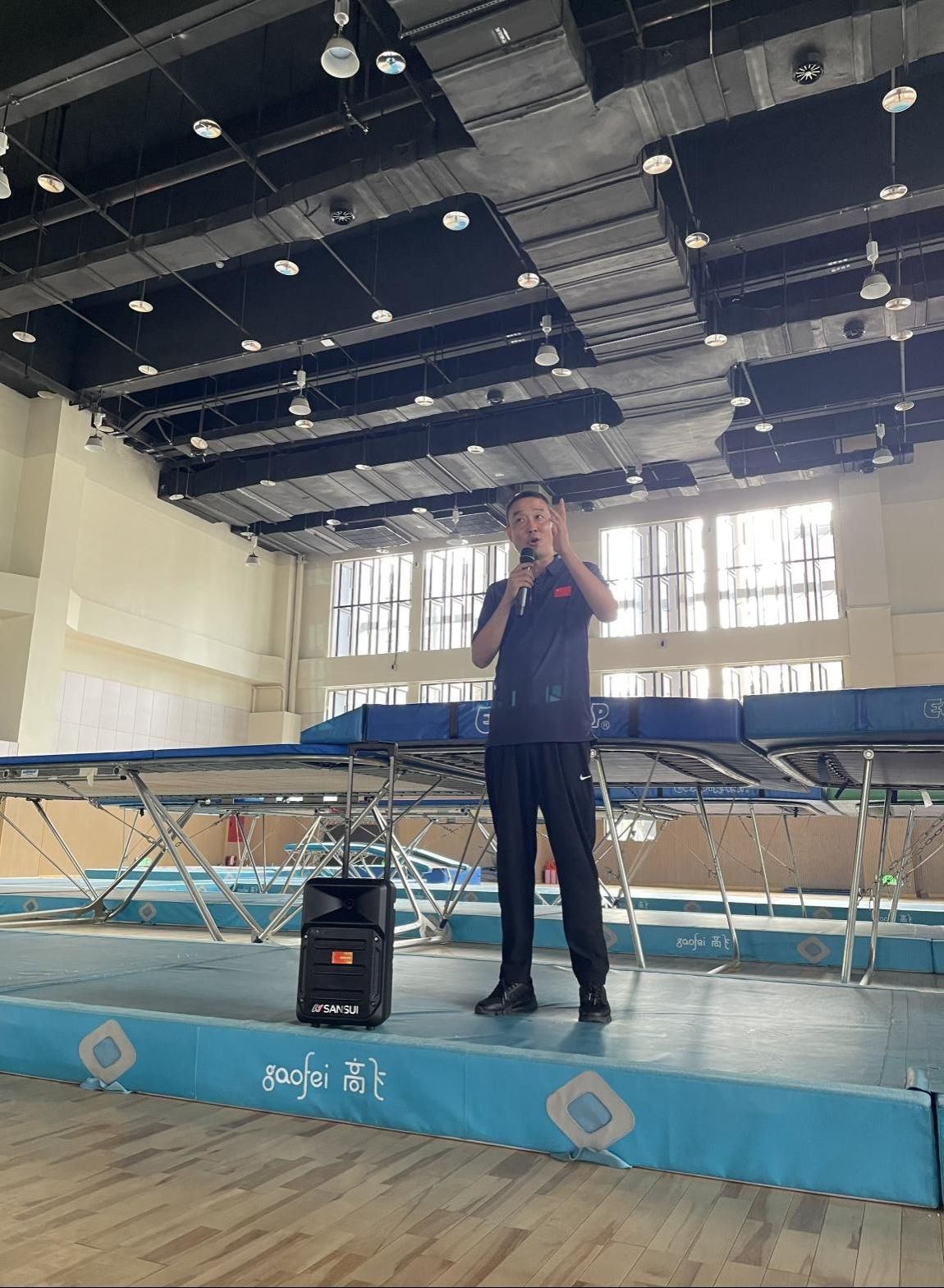 最后,队伍再次回到出发地——体操馆。李德华副院长和体操教研室副主任杨光厅详细介绍了体操馆赛事承载能力、功能以及学校体操项目辉煌的发展历程。体操馆能满足蹦床、竞技体操、艺术体操、健美操、技巧、啦啦操等项目的教学与训练需求,同时服务于四川省高水平艺术体操、蹦床队伍的训练,从空间、设施设备均满足全国性专业比赛的需求。体操教研室教师团队一直秉承“勤奋执着、追求完美、勇于创新、团结协作”的体操精神,经过一代代体操人的辛勤耕耘,《体操运动》获评省级精品共享课程、省级线上一流课程、国家级混合式一流课程、省级课程思政示范课程;《艺术体操》获评省级精品课程;特色课程《团体操》日趋成熟,国内外影响广泛;中小学“特色课间操”实践项目取得了较好的教学效果和社会效益。