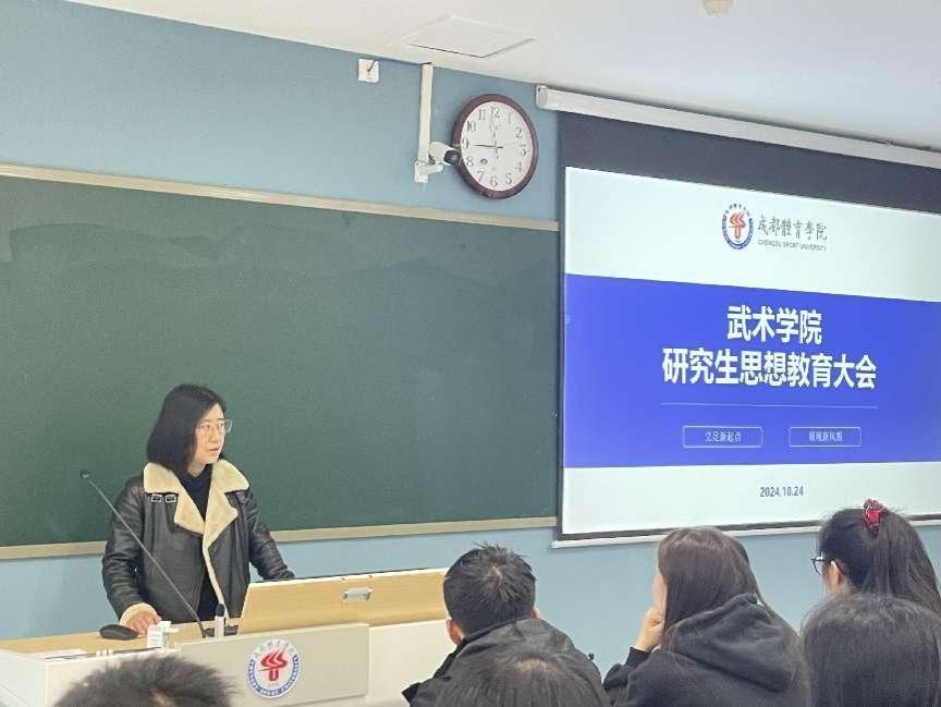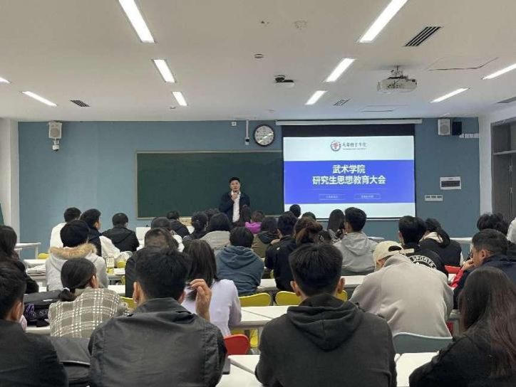 会议指出,武术学院作为传承和弘扬中华武术的重要阵地,在新校区的全面办学中,致力于将武术精神融入到研究生的思想政治教育中,形成独特的校园文化。全院研究生要通过秉持“厚德尚武,追求卓越”的院训,弘扬中华成体精神,树立正确的“学习观”,坚定理想信念,锤炼意志品质。会议强调,在新校区的全新起点上,研究生们应肩负起更高的历史使命。新时代青年作为未来的社会栋梁,要不断强化学习态度,刻苦钻研,创新实干,永远奋斗在科研路上。
