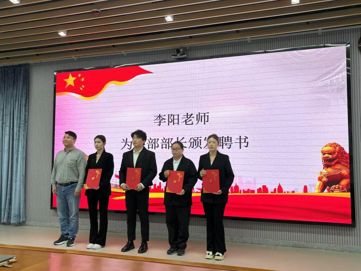 武术学院团总支书记刘洪源老师随后宣布了新一届团总支学生会的组成名单。罗兴山书记与李阳老师为新任学生会干部颁发了聘任证书,并见证了全体学生会干部的庄严宣誓。