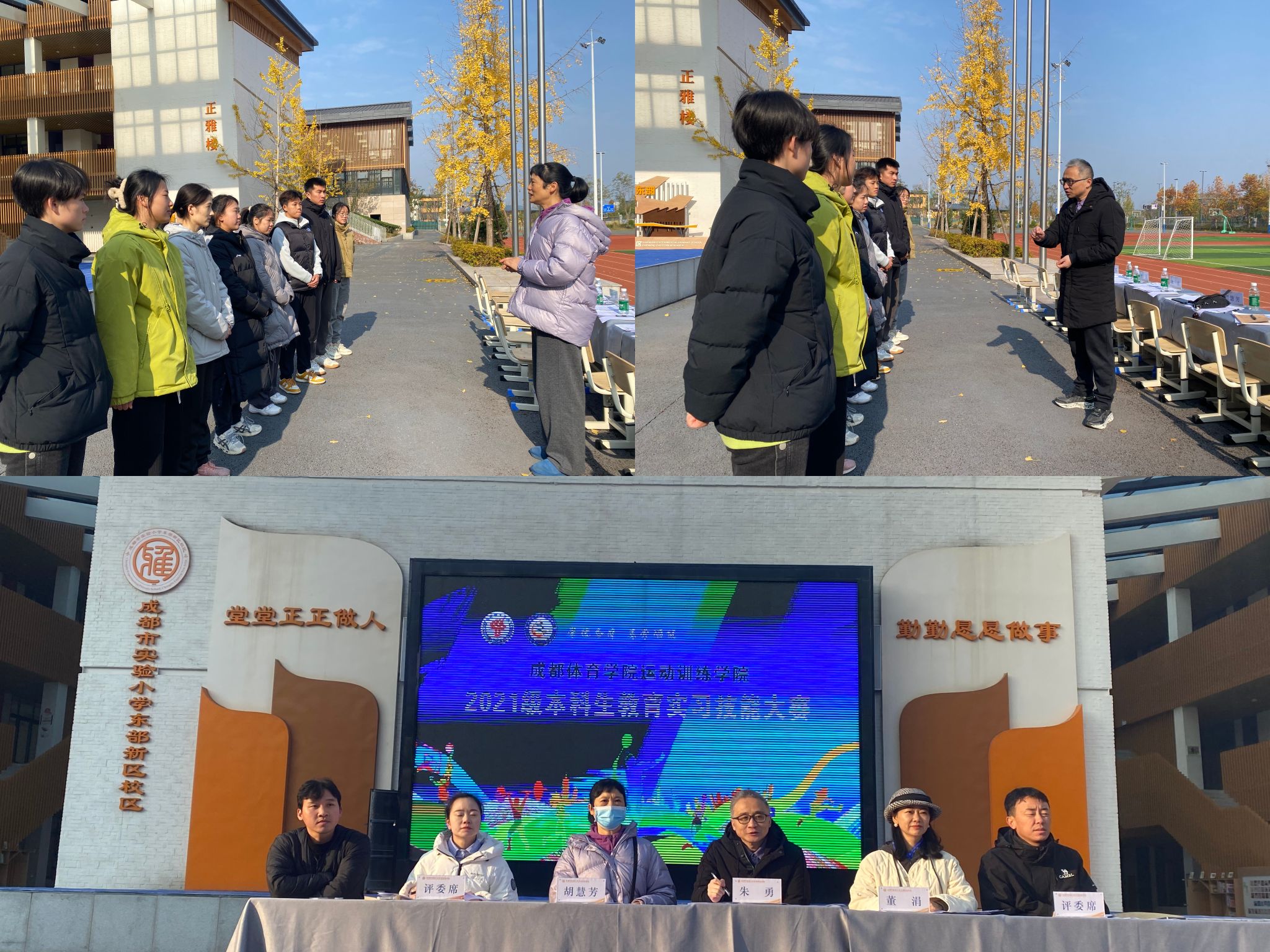 为进一步提高运动训练学院实习学生的专业技能,促进高质量就业,运动训练学院于12月11日上午在成都市实验小学东部新区校区举行2021级本科生实习技能大赛,allwincity万象城官方网站运动训练学院党委副书记朱勇、allwincity万象城官方网站胡惠芳副教授、成都市教科院附中初中部副校长董涓、成都市实验小学体育教研组长何帆等作为评委参加活动。此次特别邀请成都市教科院附中(成都高级中学)作为用人单位参加我院实习技能大赛,进一步加强与用人单位的合作。