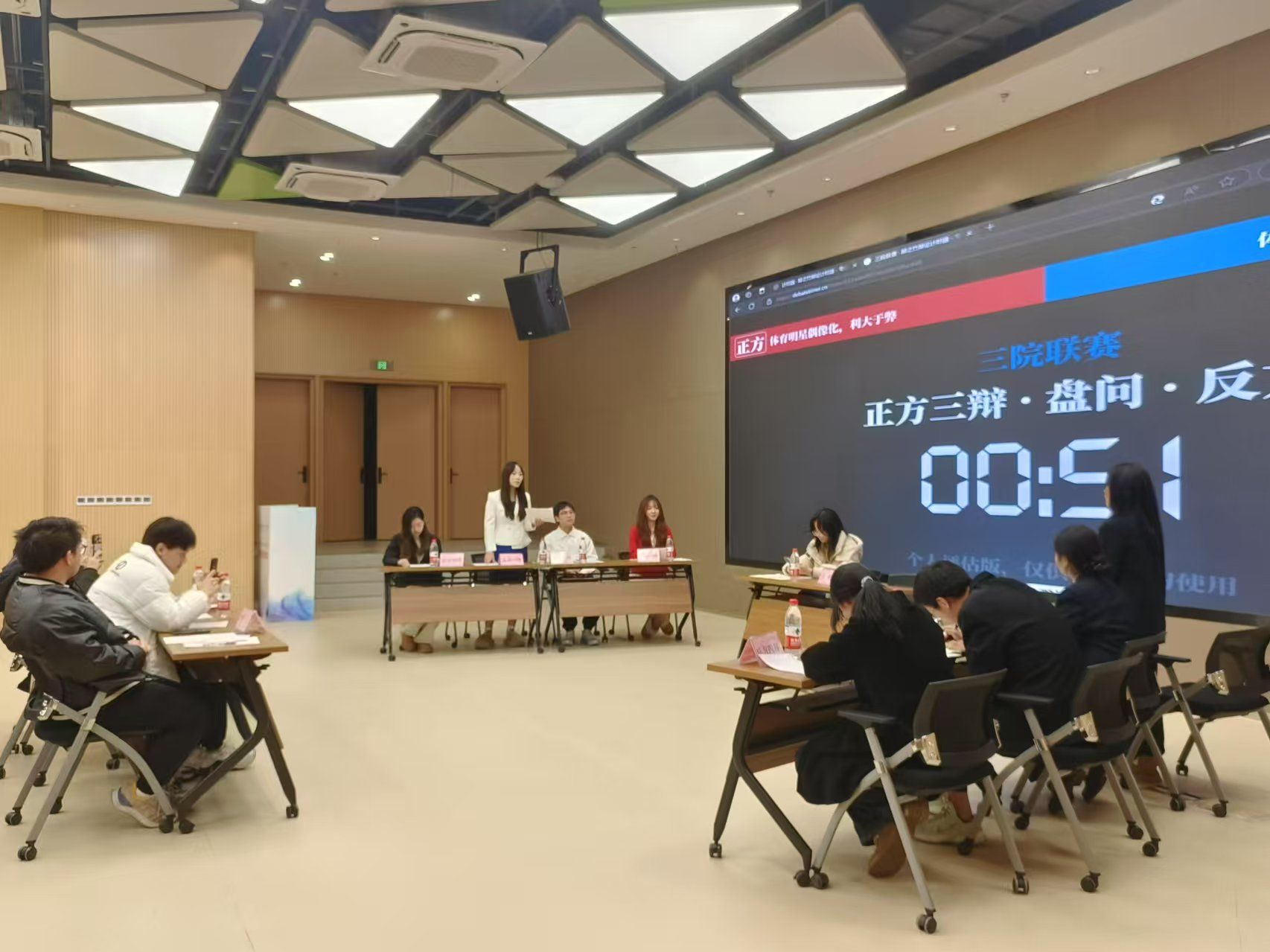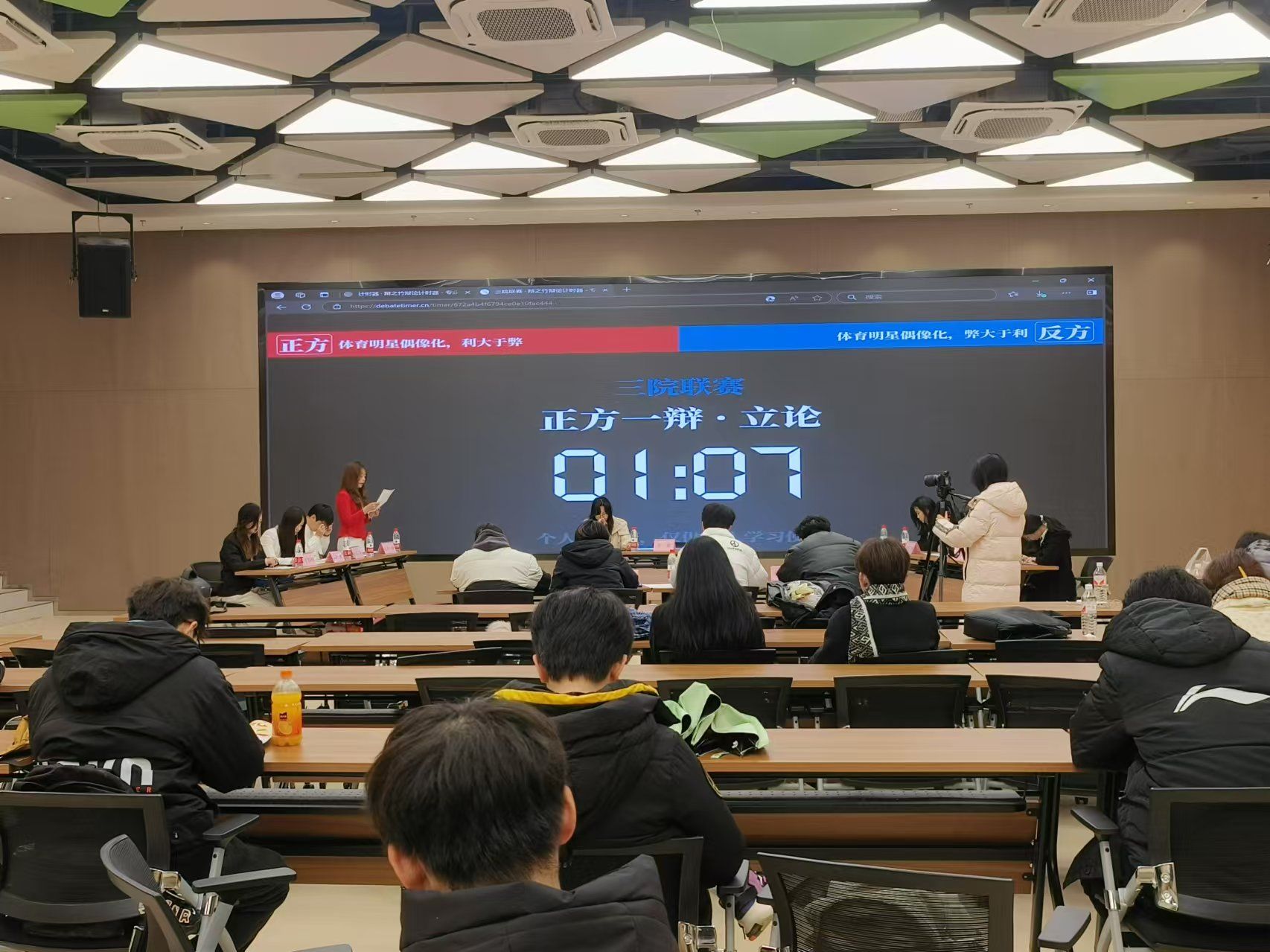 新闻与传播学院派出两支队伍,分别迎战经济管理学院和运动医学与健康学院辩论队。四支队伍分别围绕“体育明星偶像化,利大于弊还是弊大于利”和“离婚类综艺节目对年轻人价值观的塑造,利大于弊还是弊大于利”两个辩题展开辩论。新传辩论队队长莫俊贤、经管学院辩论队队长李岳桦、校辩论协会会长吴嘉玲担任辩论赛评委。