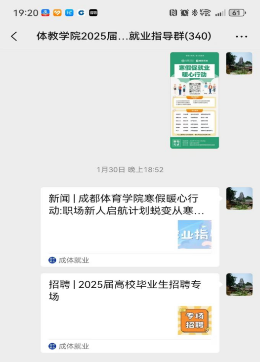 精准推送就业岗位,架起供需“连心桥”。学院全员联动,在努力为学生拓展就业渠道和岗位的同时,充分用各级网络平台和校友资源,通过国家、省大学生就业服务平台、校就业网、毕业校友等多渠道收集用人单位招聘信息,并利用“体教学院2025届毕业生就业指导群”微信群,及时、准确向毕业生精准推送就业岗位信息和招聘信息。累计推送就业信息31条,合计就业岗位70余个,促成落实就业16人,为毕业生搭建起便捷高效的就业信息平台。