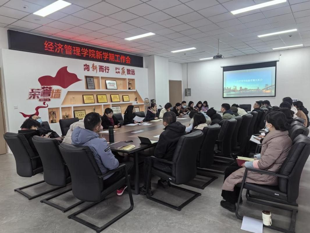经济管理学院于2月27日在运动休闲馆328召开了新学期工作会。会议由院长郭新艳主持,学院全体教职工参加。会上总结了2024年工作成果,部署了2025年新学期重点工作,并探讨学院未来发展规划。