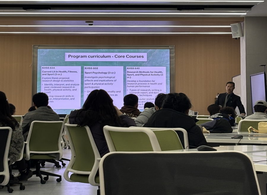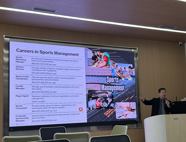 萧博士以宾州印第安纳大学IUP的百年发展史为切入点,讲述该校的办学理念与学术积淀,以及校园周边汇聚的职业体育联盟、大型赛事场馆及体育产业资源。同时,他介绍了IUP的体育管理专业、本科课程内容、硕士项目方向以及实践平台。此外,他还特别强调IUP的“实践育人”特色。