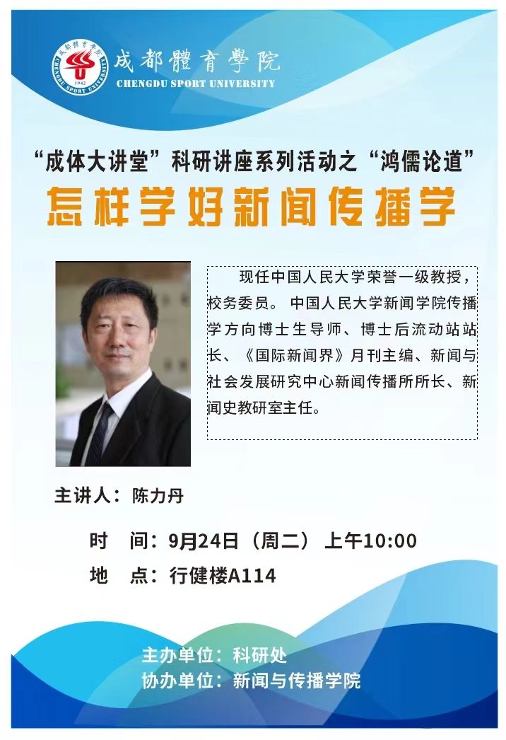 学校将于2024年9月24日(周二)上午10:00在行健楼A114举行“成体大讲堂”科研讲座系列活动之“鸿儒论道”。本次讲座特邀中国人民大学陈力丹教授主讲。题目为:怎样学好新闻传播学。欢迎全校师生积极参加。