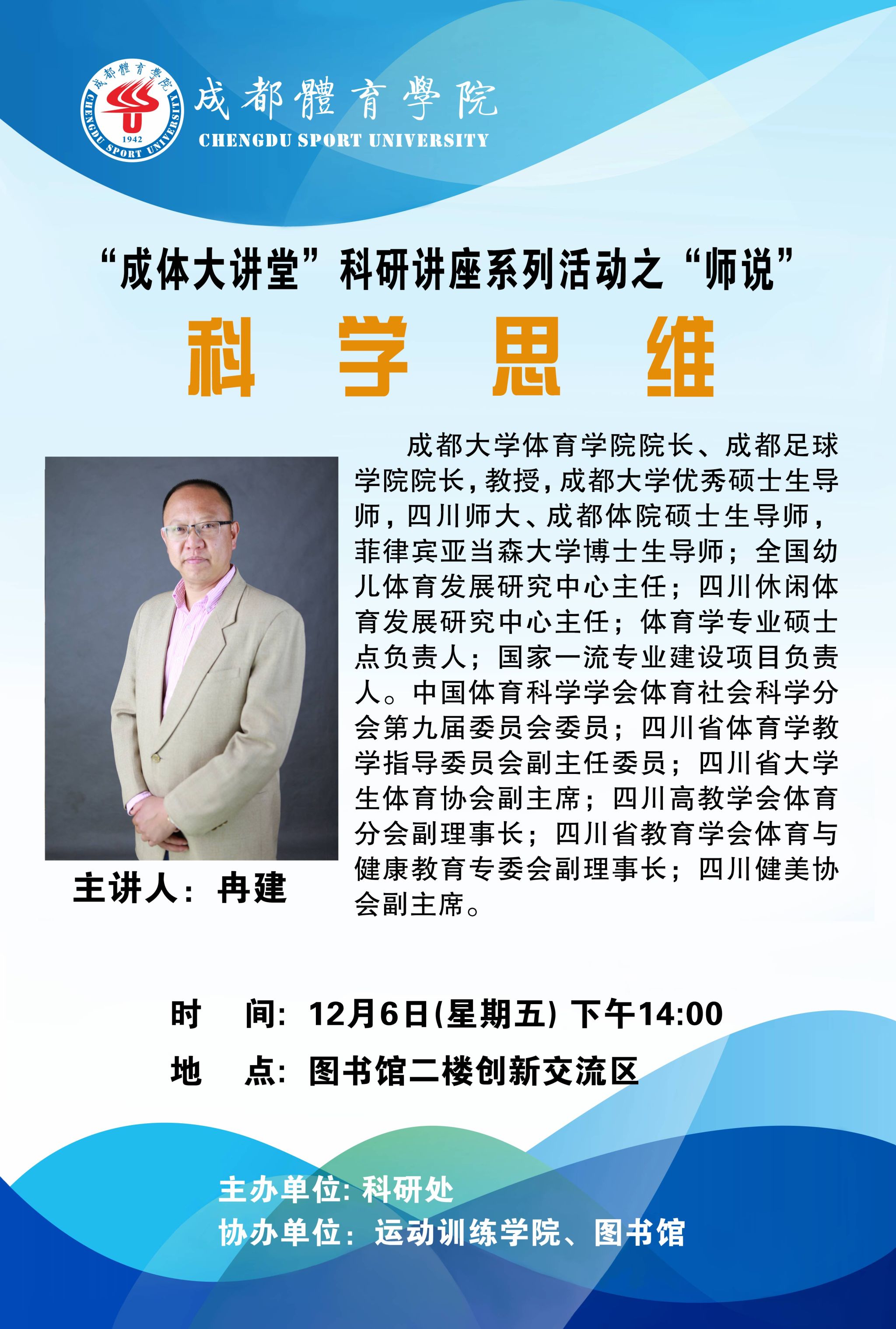 学校将于2024年12月6日(周五)下午14:00在图书馆二楼创新交流区举行“成体大讲堂”科研讲座系列活动之“师说”。本次讲座特邀成都大学体育学院院长冉建教授主讲。题目为:《科学思维》。欢迎广大科研人员积极参加。